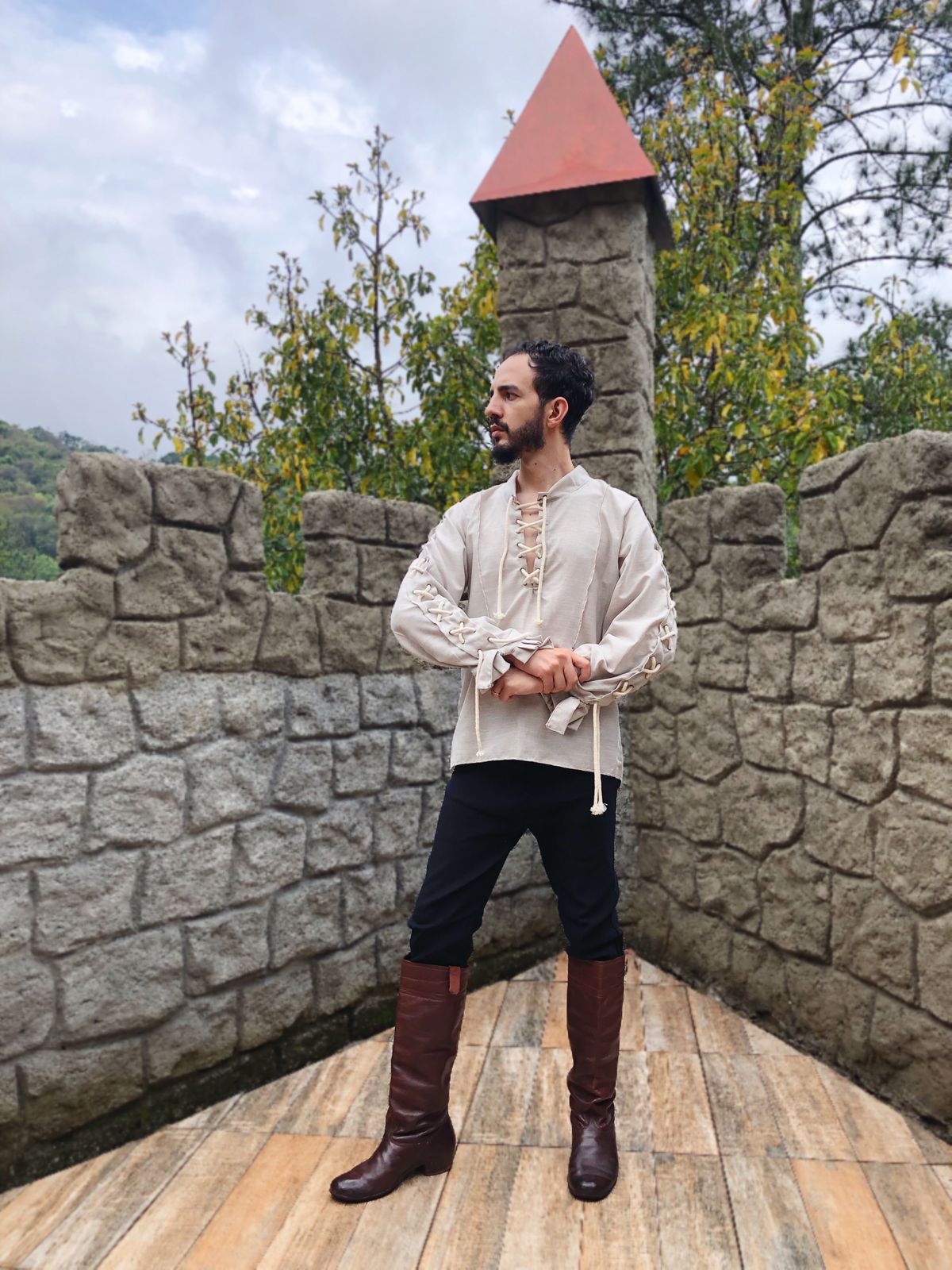 Feita em linho misto, com amarrações no peito e nas mangas, essa túnica traz autenticidade e estilo para looks medievais, renascentistas ou temáticos.